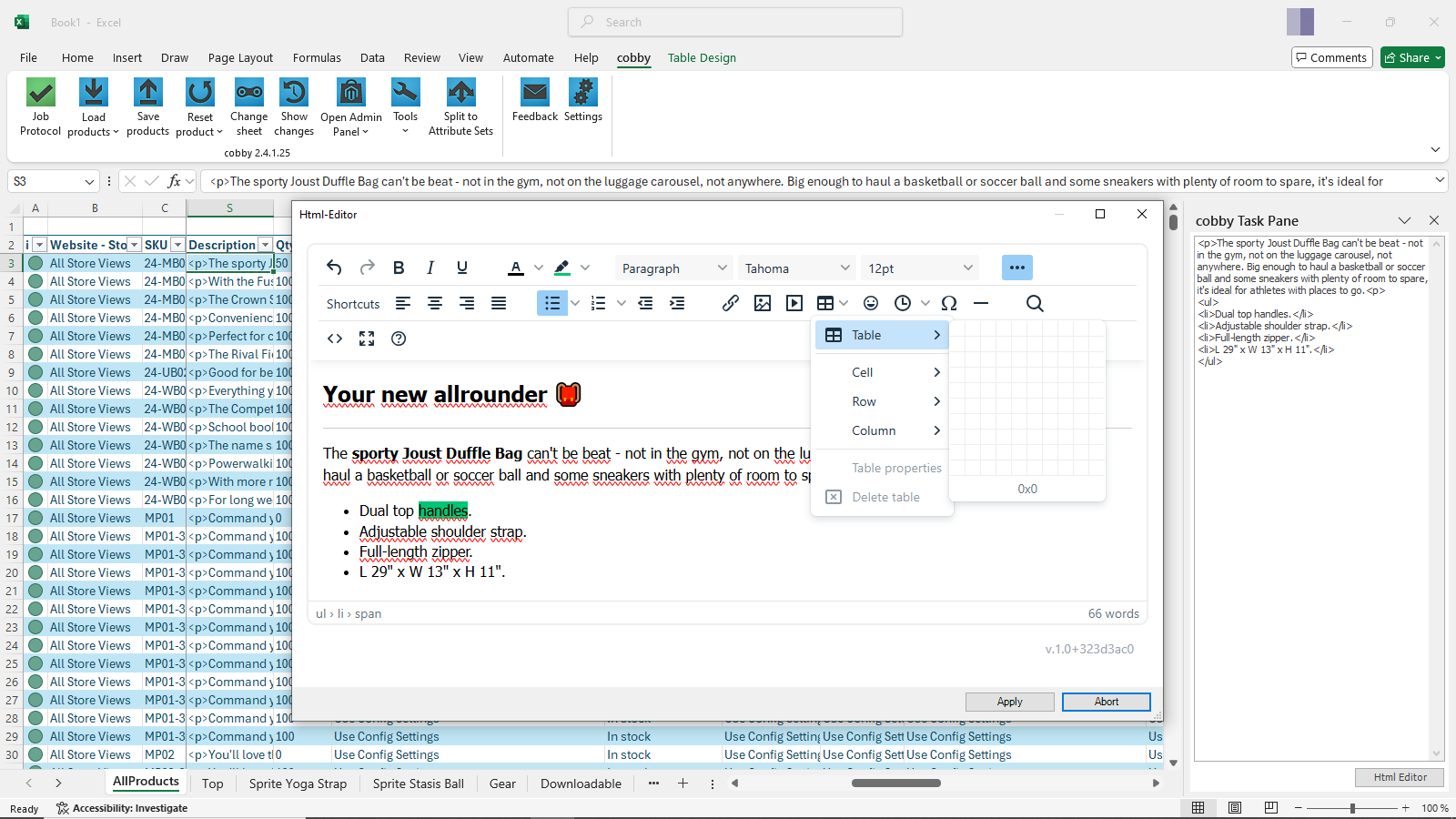 Via the cobby Task Pane the text content of a cell is displayed in HTML. The HTML editor can be opened via the button at the bottom right of the screen.