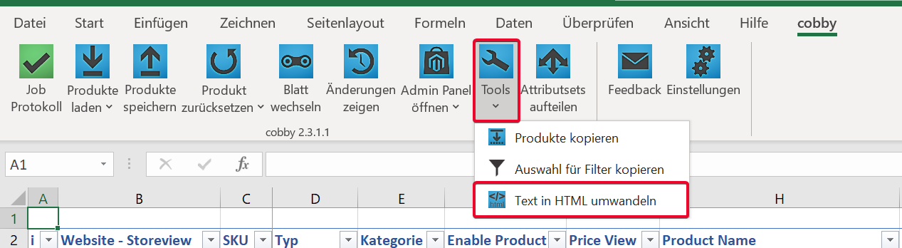 In cobby, a range of cells can be selected whose contents can be automatically converted to HTML. It is also automatically detected whether the cells have already been converted or not.